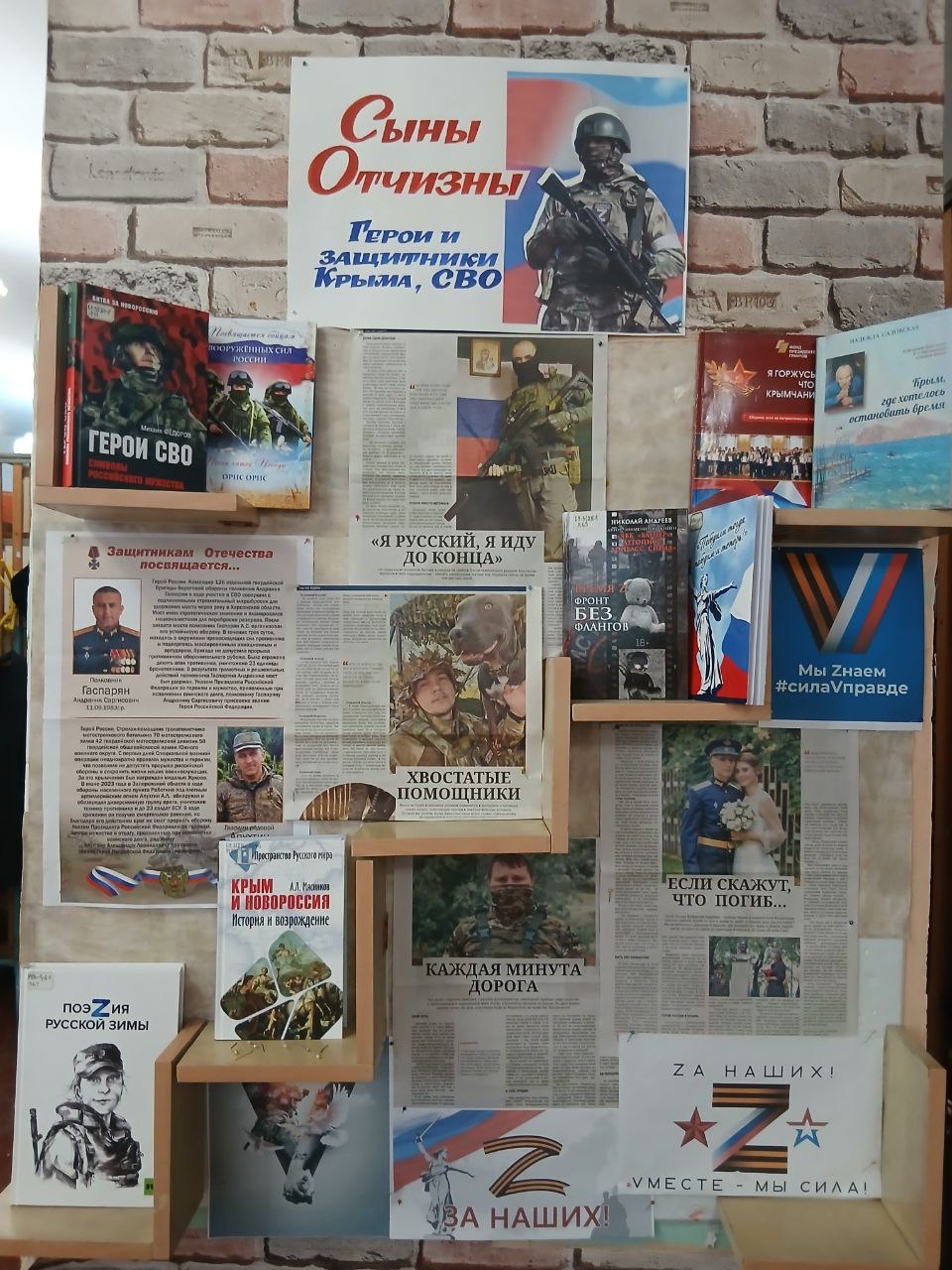 24 февраля 2026 года библиотека-филиал № 6 им. А. П. Чехова представила своим читателям книжную выставку «Сыны Отчизны» Герои и защитники Крыма, СВО.